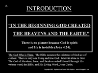Adam and Eve. Gen. 1-3. God created the heavens and the earth. He created man in His image, innocent and free from sin. God permitted Satan to tempt Eve. Man became a sinner in need of a Savior. Macro-evolution is a lie. God is good and His ways are perfect.